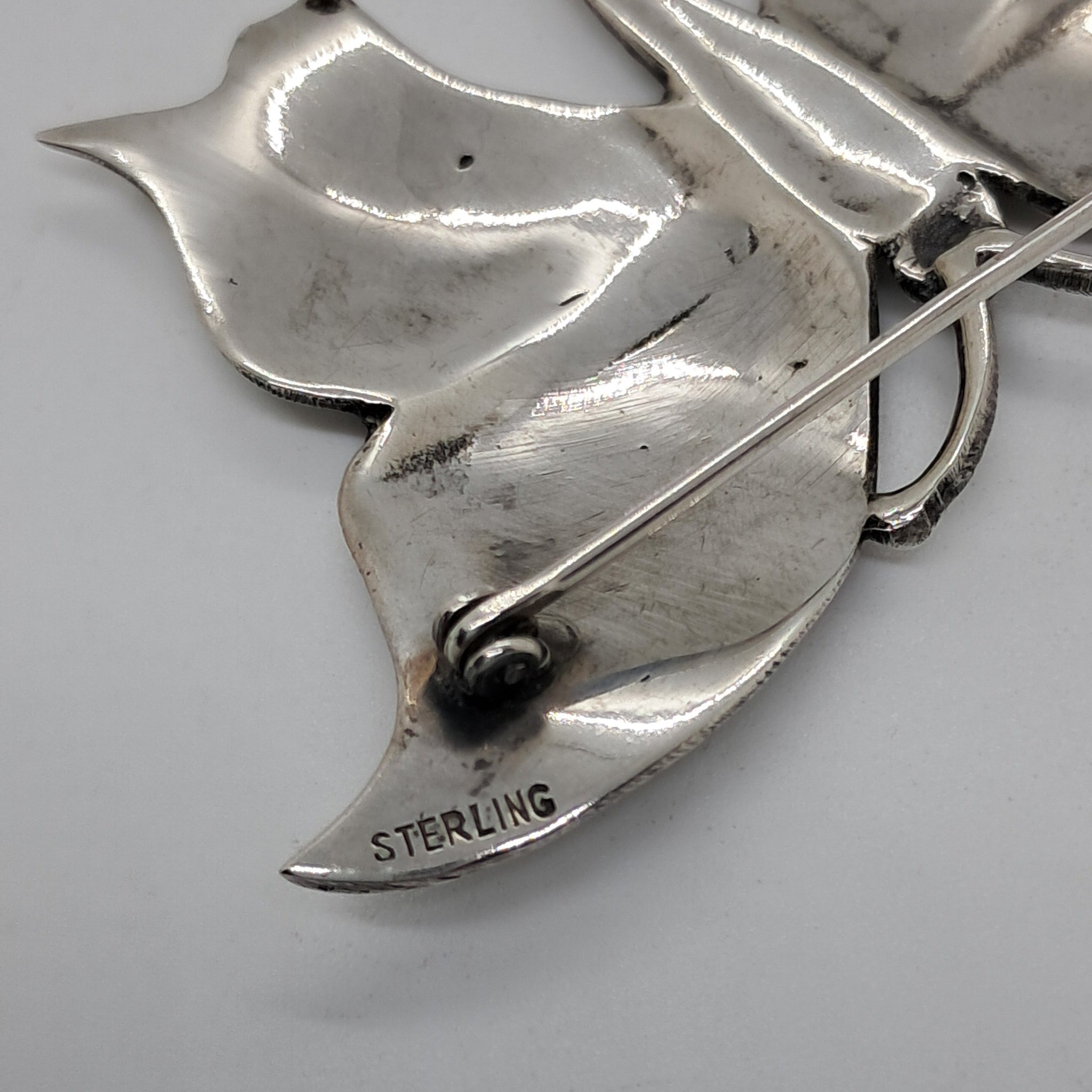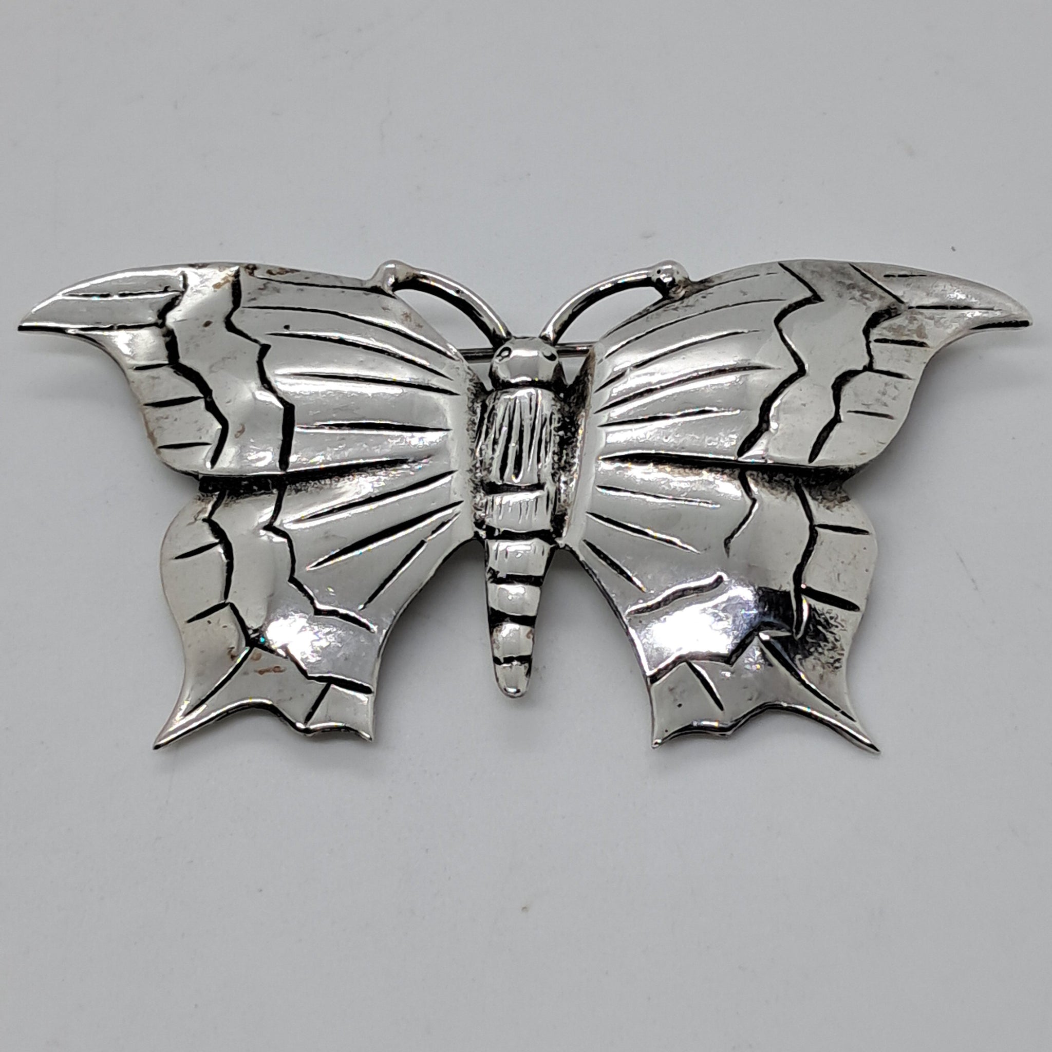 This is a stunning solid heavy beautifully engraved brooch in the form of a butterfly. It is from c 1920. It measures 7.5 cms across by 4.2cms deep. Marked sterling and the letter M which may be the makers mark.