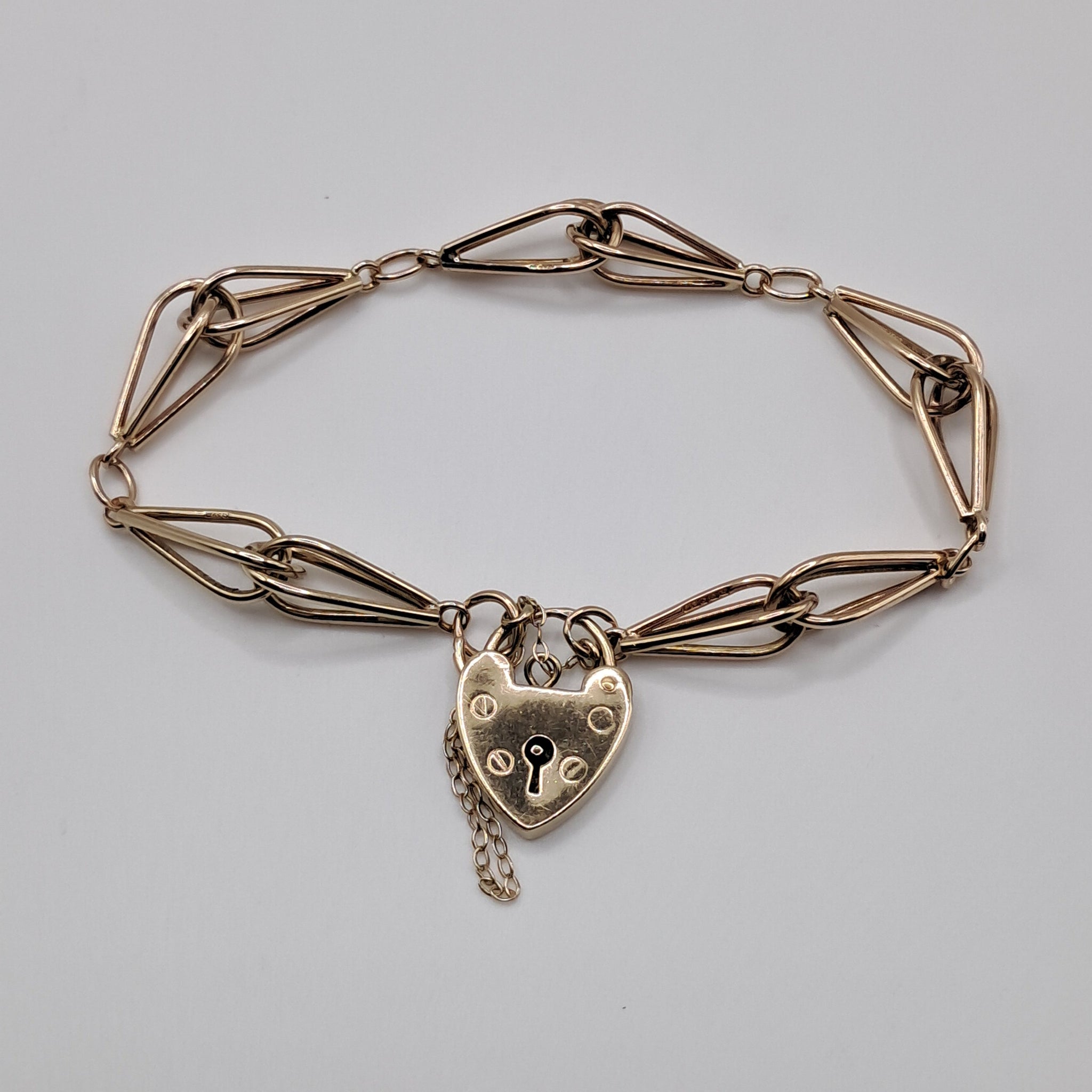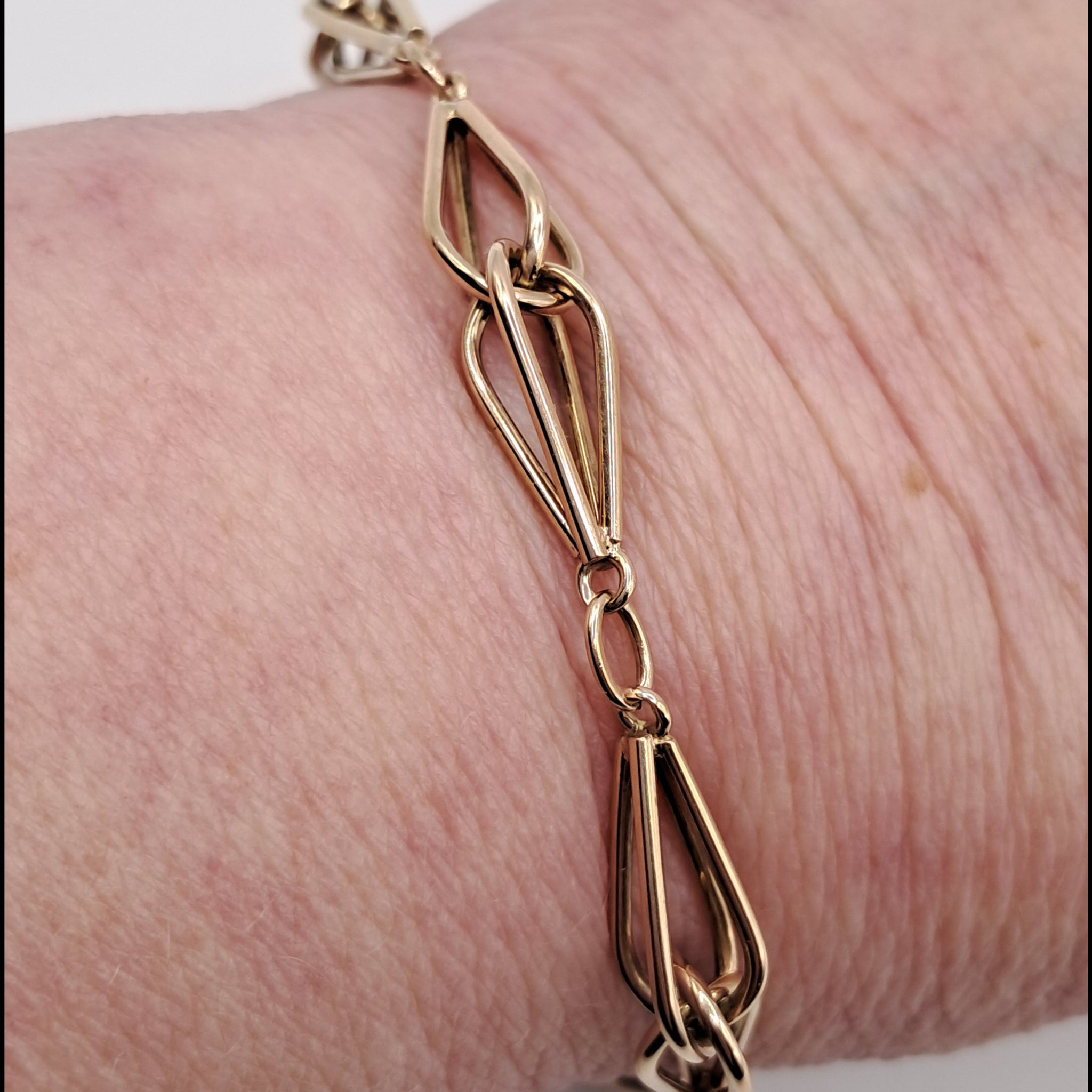 This is a lovely bracelet with the most unusual link. They look like little whisks and there are ten of them. It comes with its lock and chain intact and in perfect working order. It measures 20cms in length and weighs 11.8g Marked for 9ct gold.