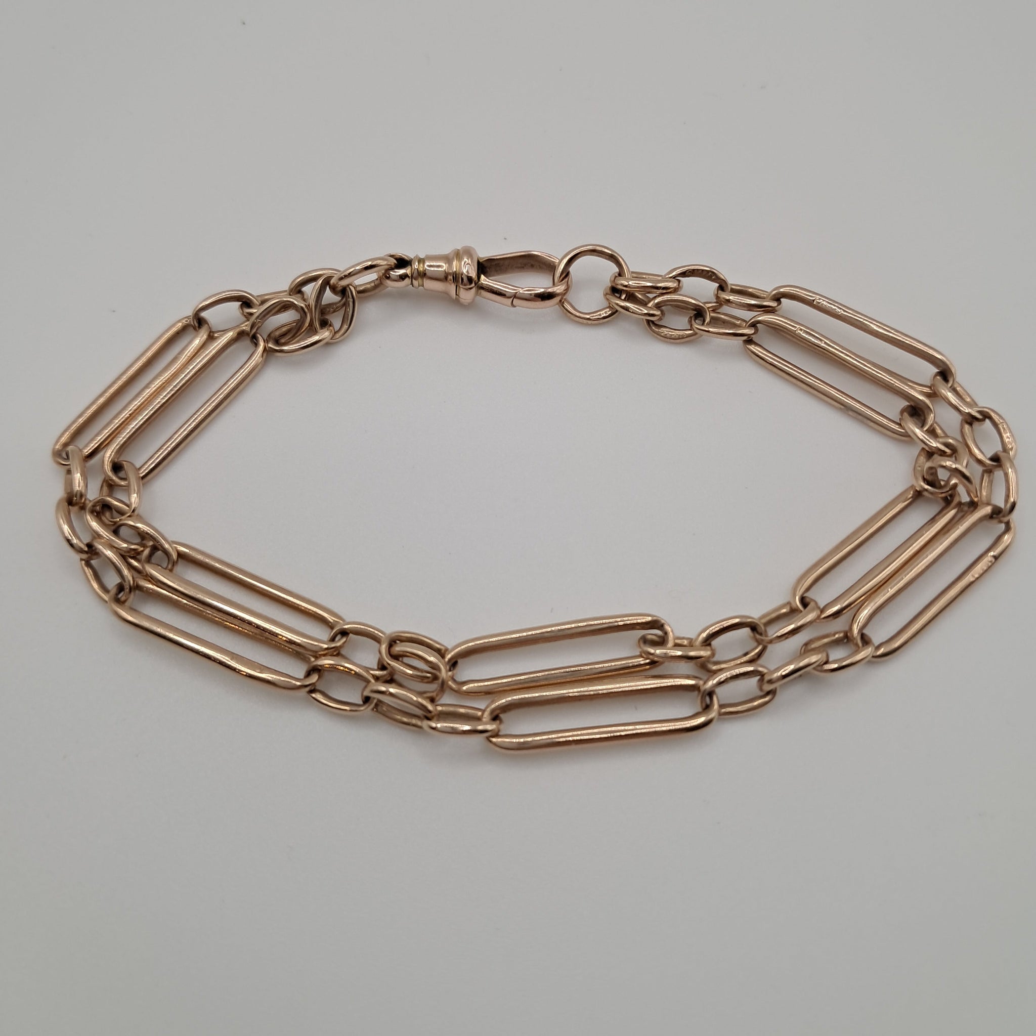 This is a fantastic bracelet with two bracelets in one. It has two rows of long link chain joined together at each end and has a dog clip closure. Each link is marked for 9ct gold as is the clasp. Measures 22 cms in length and weighs 17.5g. c 1900