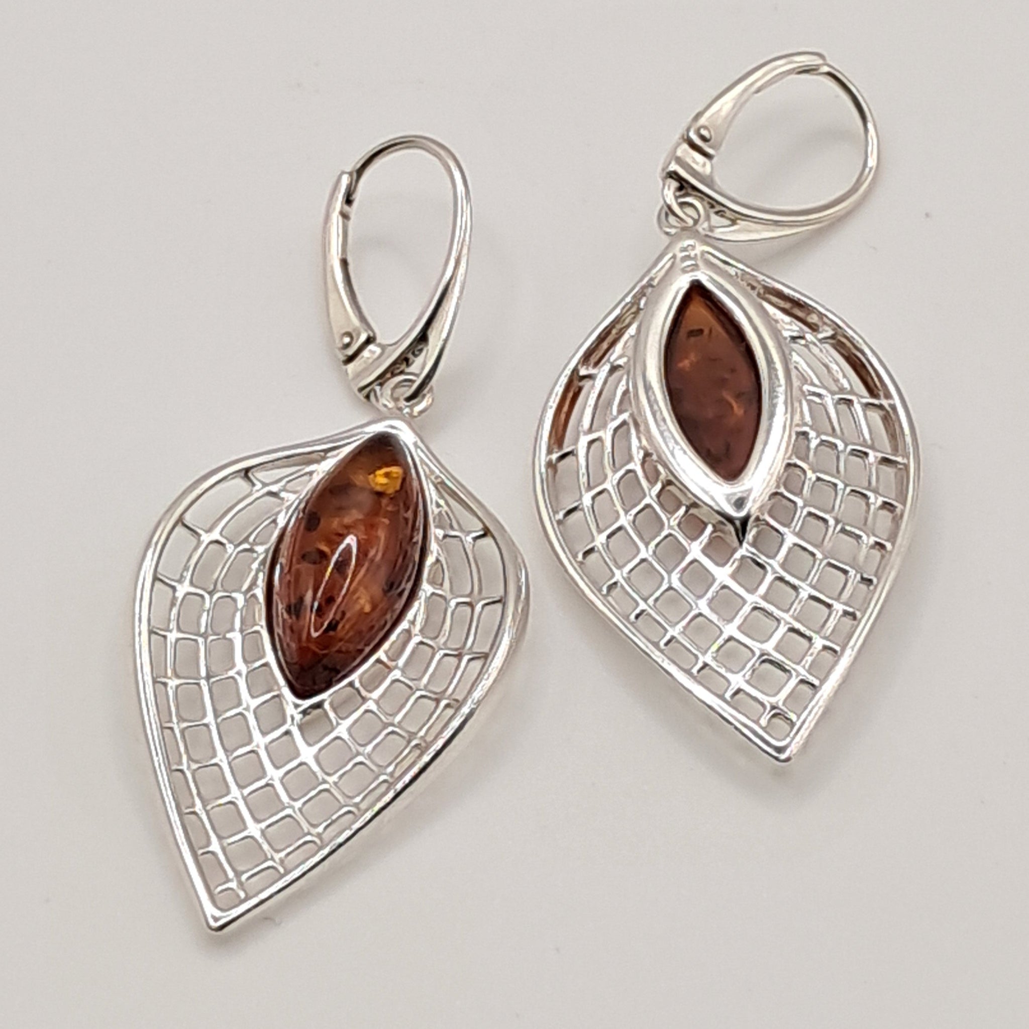 These wonderful drop earrings in the form of a peacock feather with stunning lattice work and an oval warm amber stone to the centre. They measure 5.4 cms in length including the hoop. Fully marked for sterling silver.