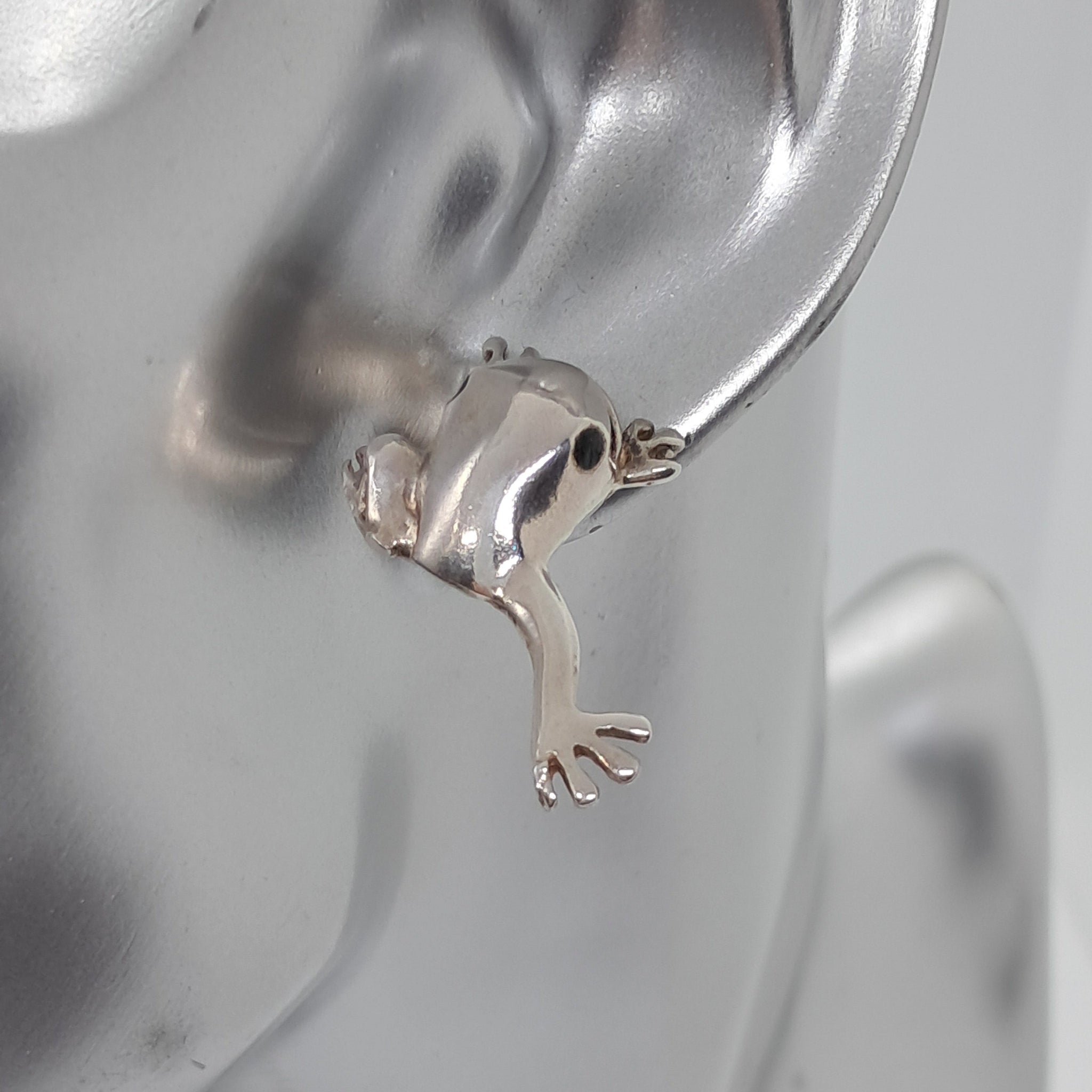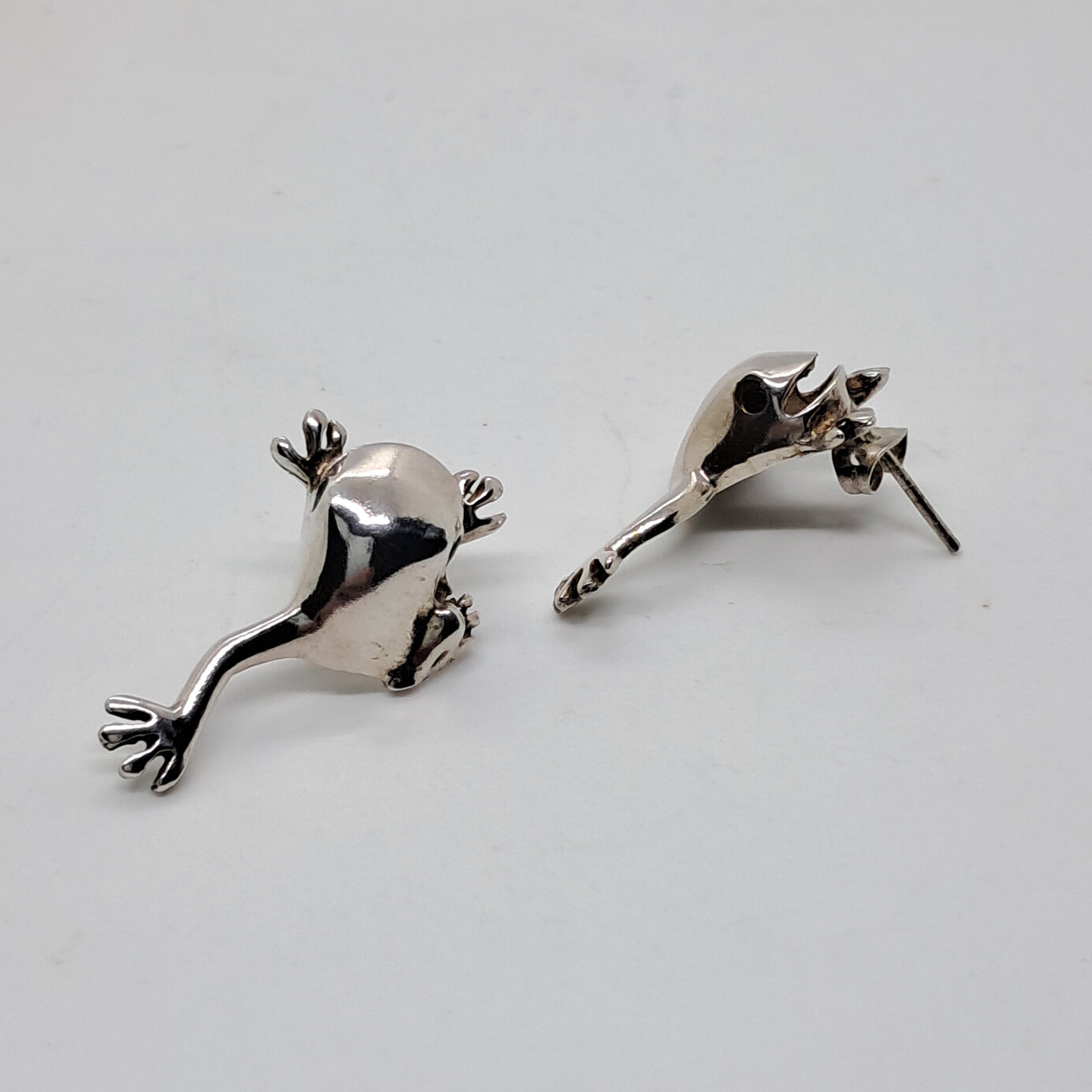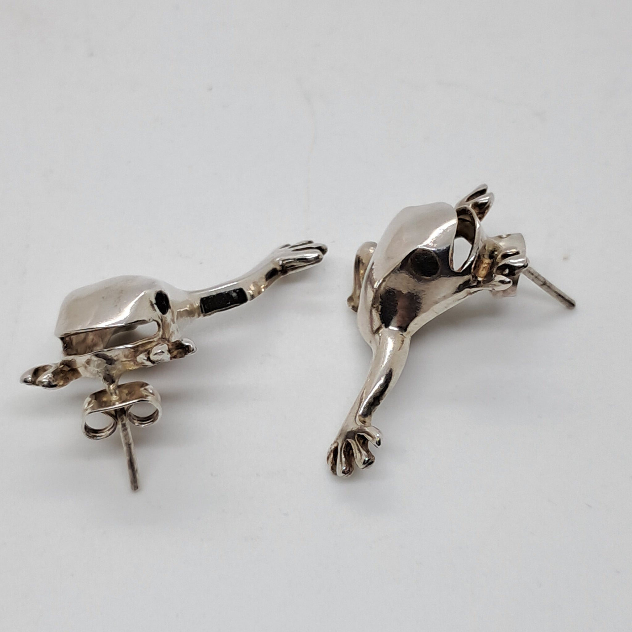 These earring are real fun pieces of jewellery. They are happy frogs with smiles on their faces and black onyx eyes, They measure 2.5cms in length and are marked for sterling silver.