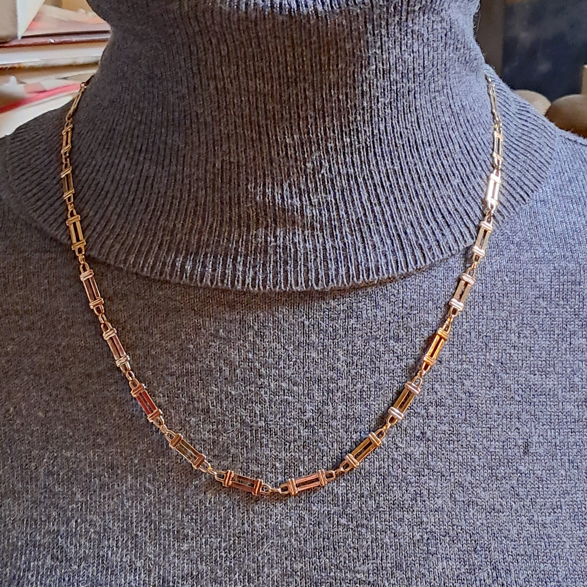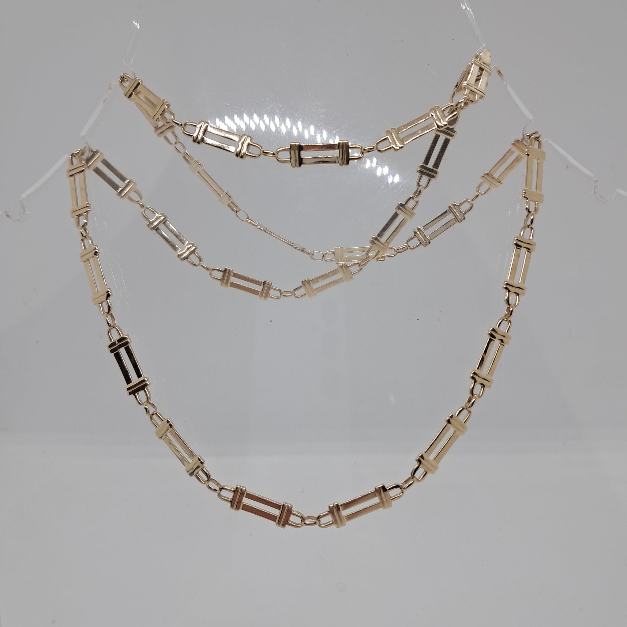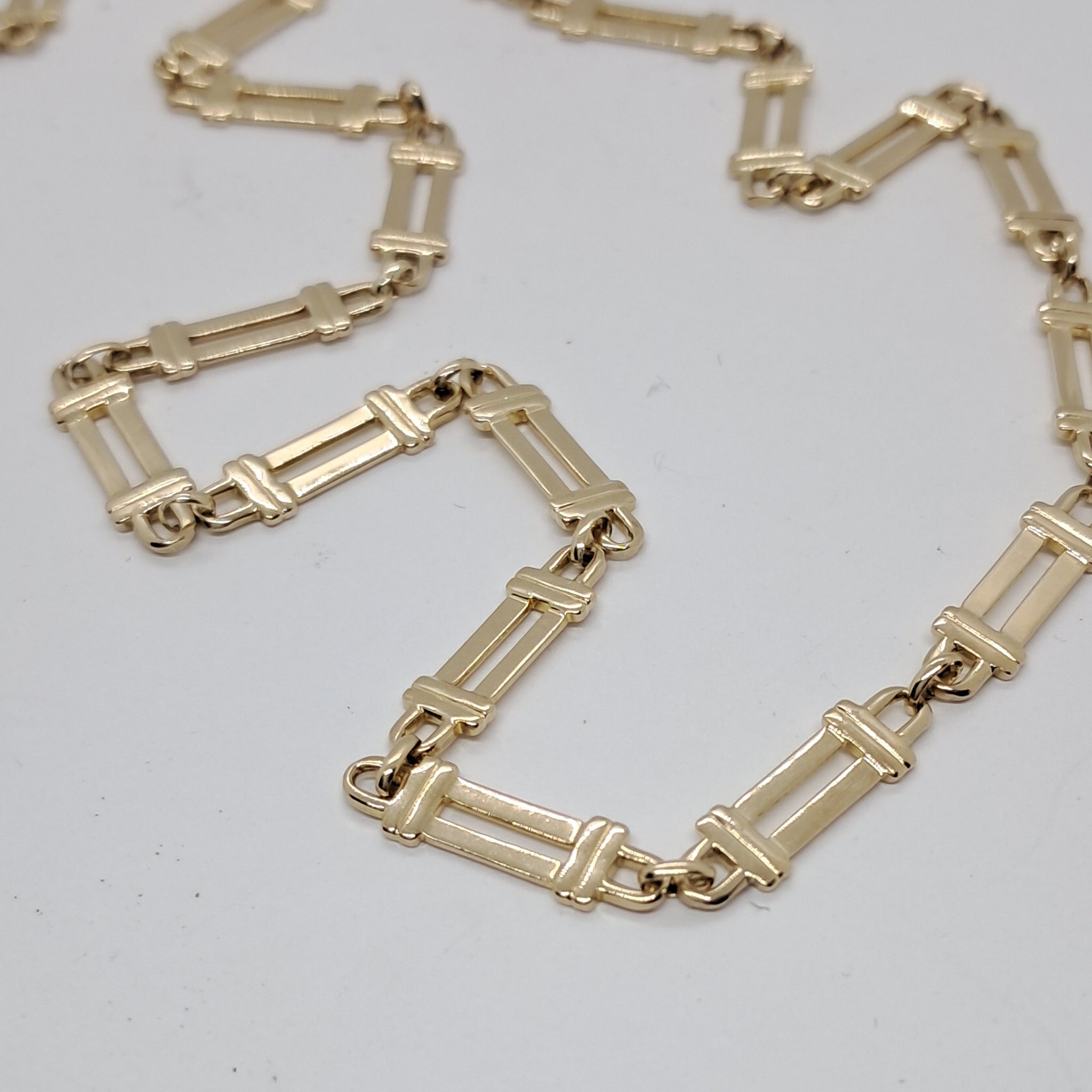 A 9ct gold necklace with really unusual links,rectangular with curved ends and little double bars. It measures 55 cms in length and 5mm across. It is fully hallmarked for 9ct gold and weighs in at 12.8g