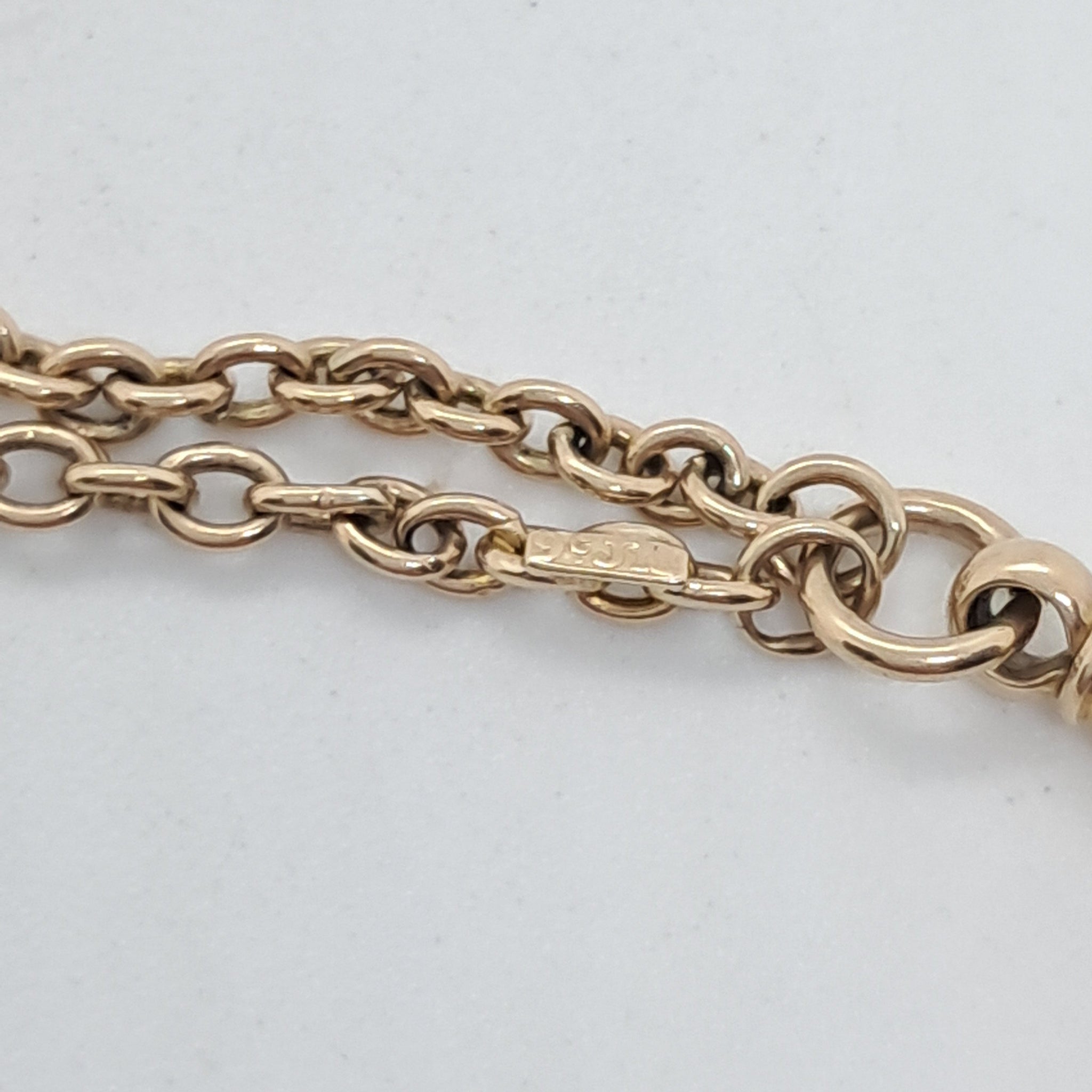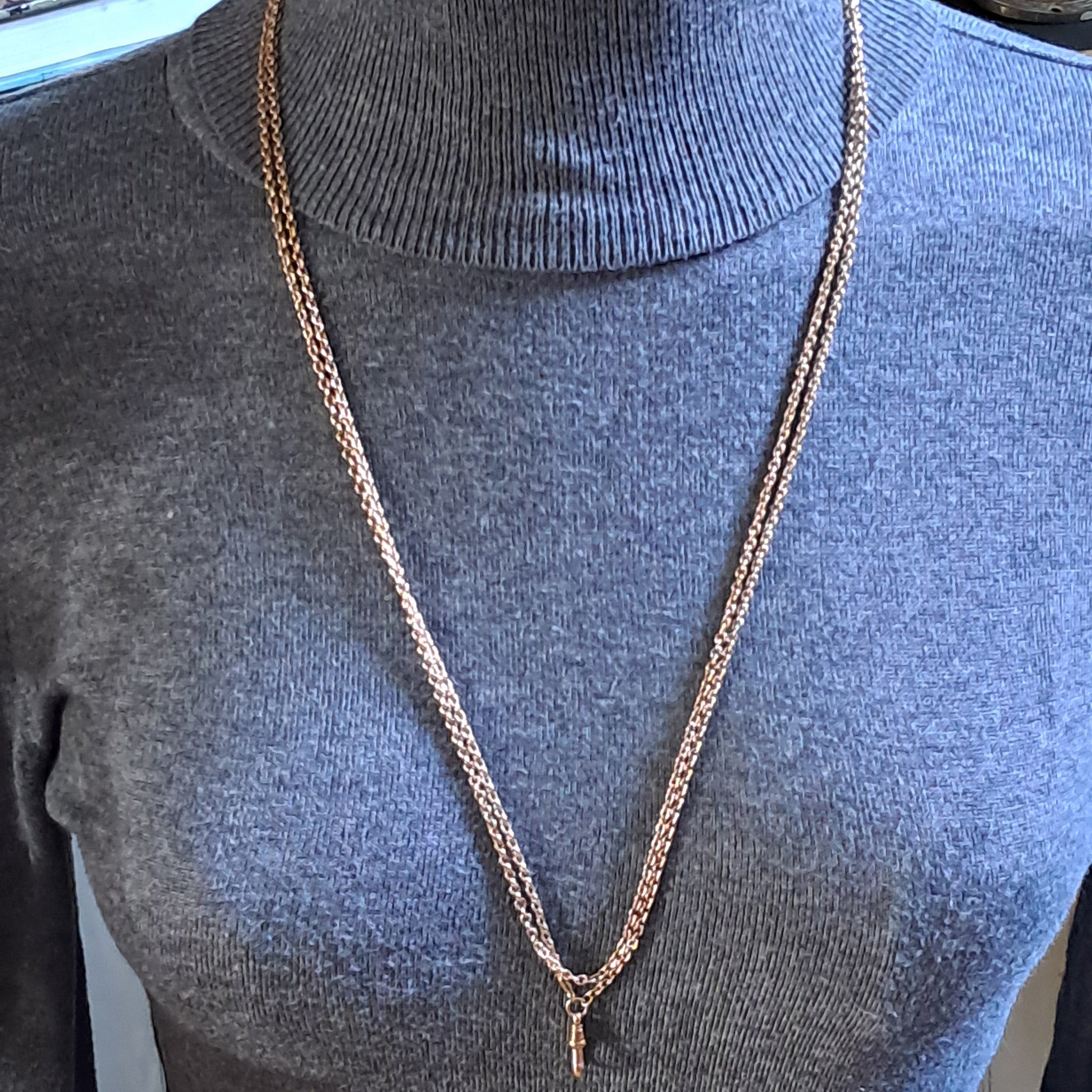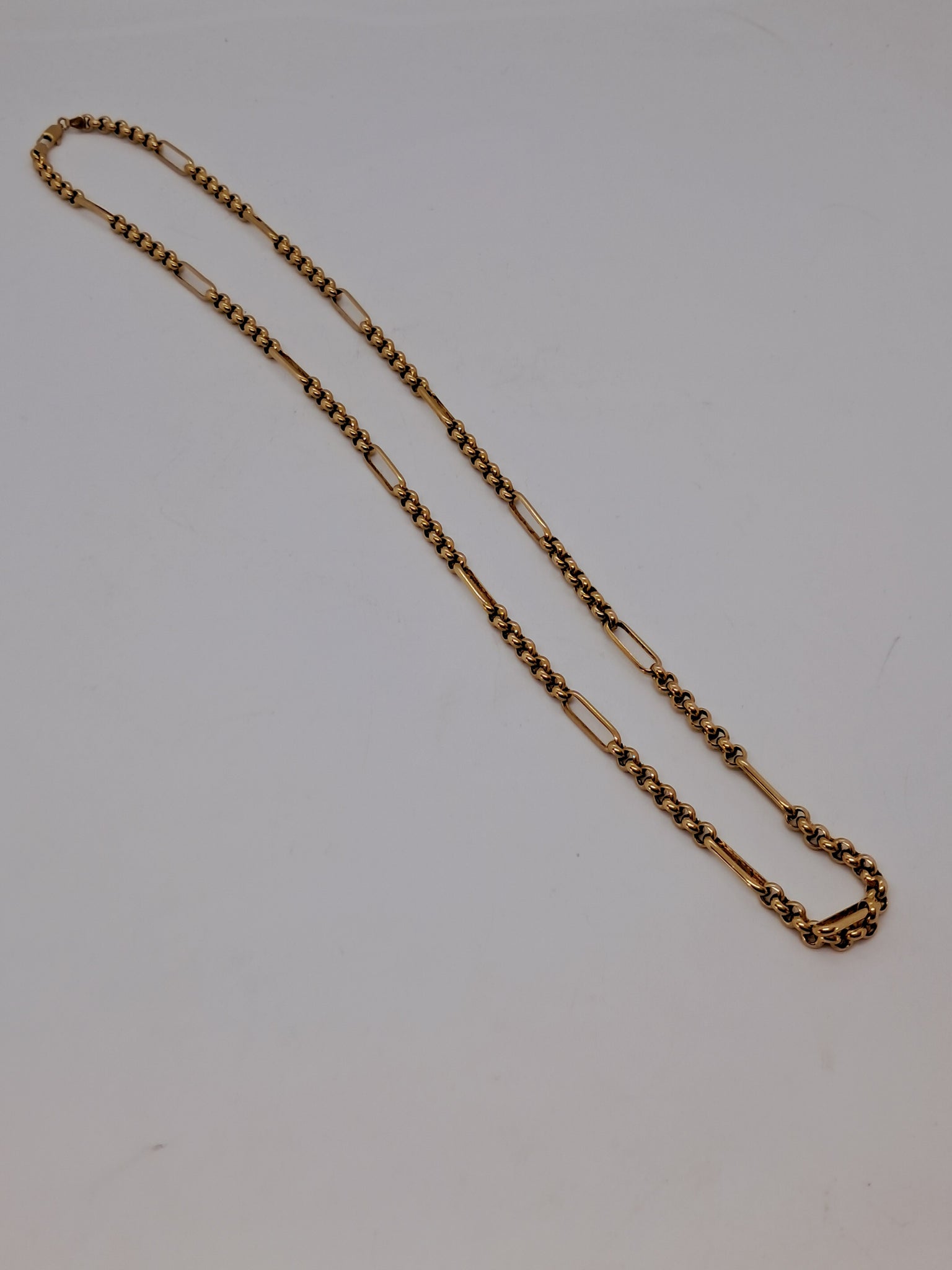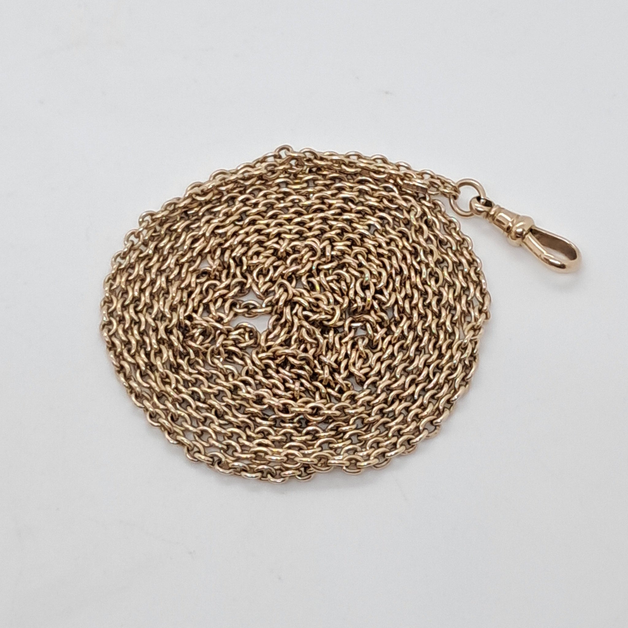 This is a wonderful example of longuard from the 19ct century. It has the little plaque with 9c and the makers initials JM, The dog clip is marked with the same marks, It measures 153cms not including the clip and weighs in at 32,2g It is a beautiful soft mellow colour and has unusual belcher chain links. c1850