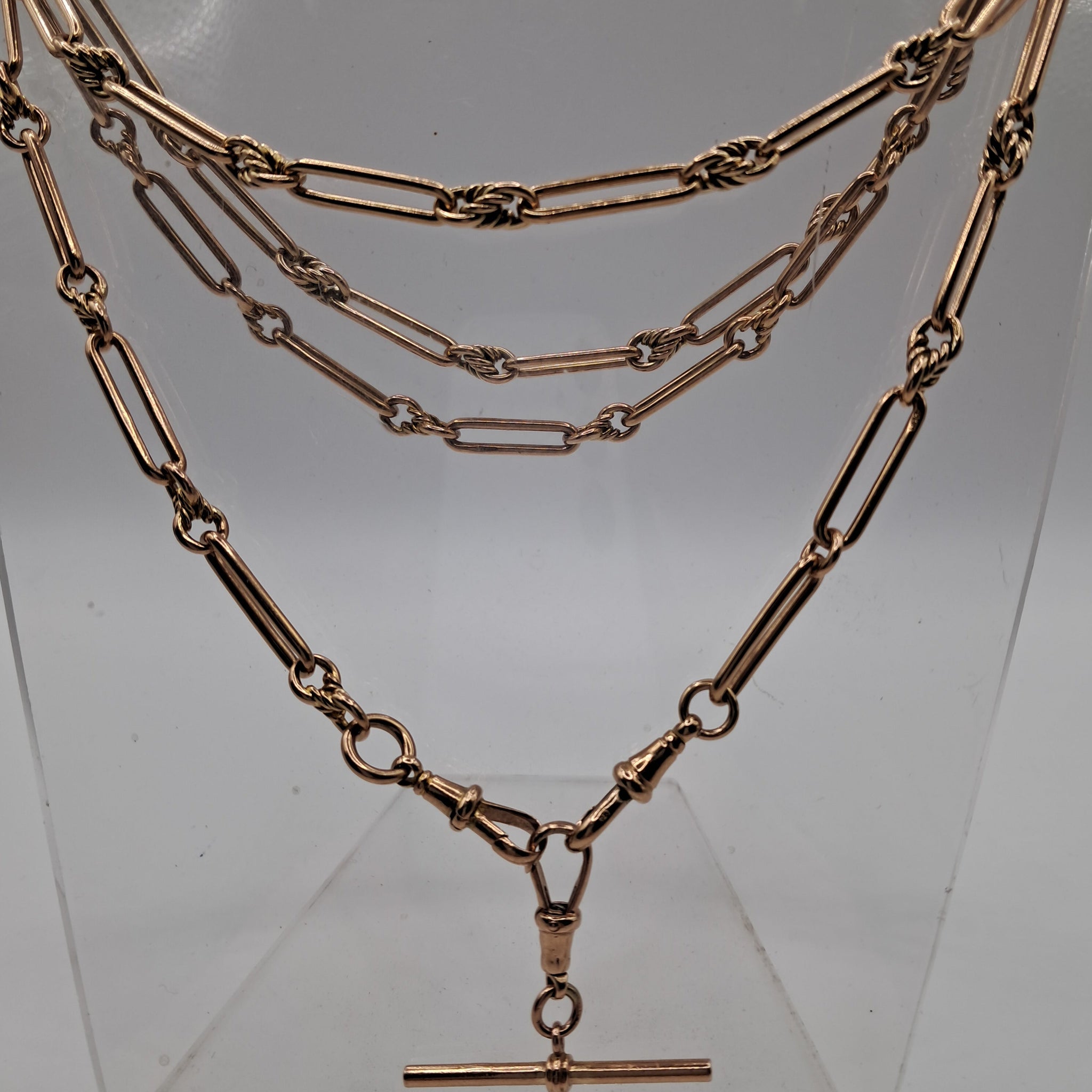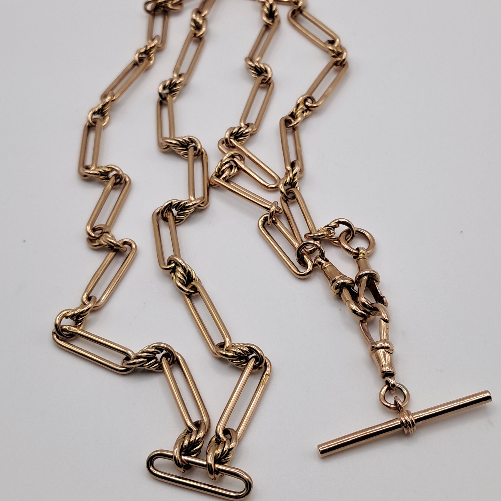 This chain necklace is spectacular.It is made up of long links 2.2cms in length joined by multi twist links and has two dog clip clasps and a removable t-bar attachment. It measures 87.5 cms in length and weighs 66g. The colour is a beautiful soft rose gold and comes from c 1900. Every link is marked 9ct 375 as is the t-bar.