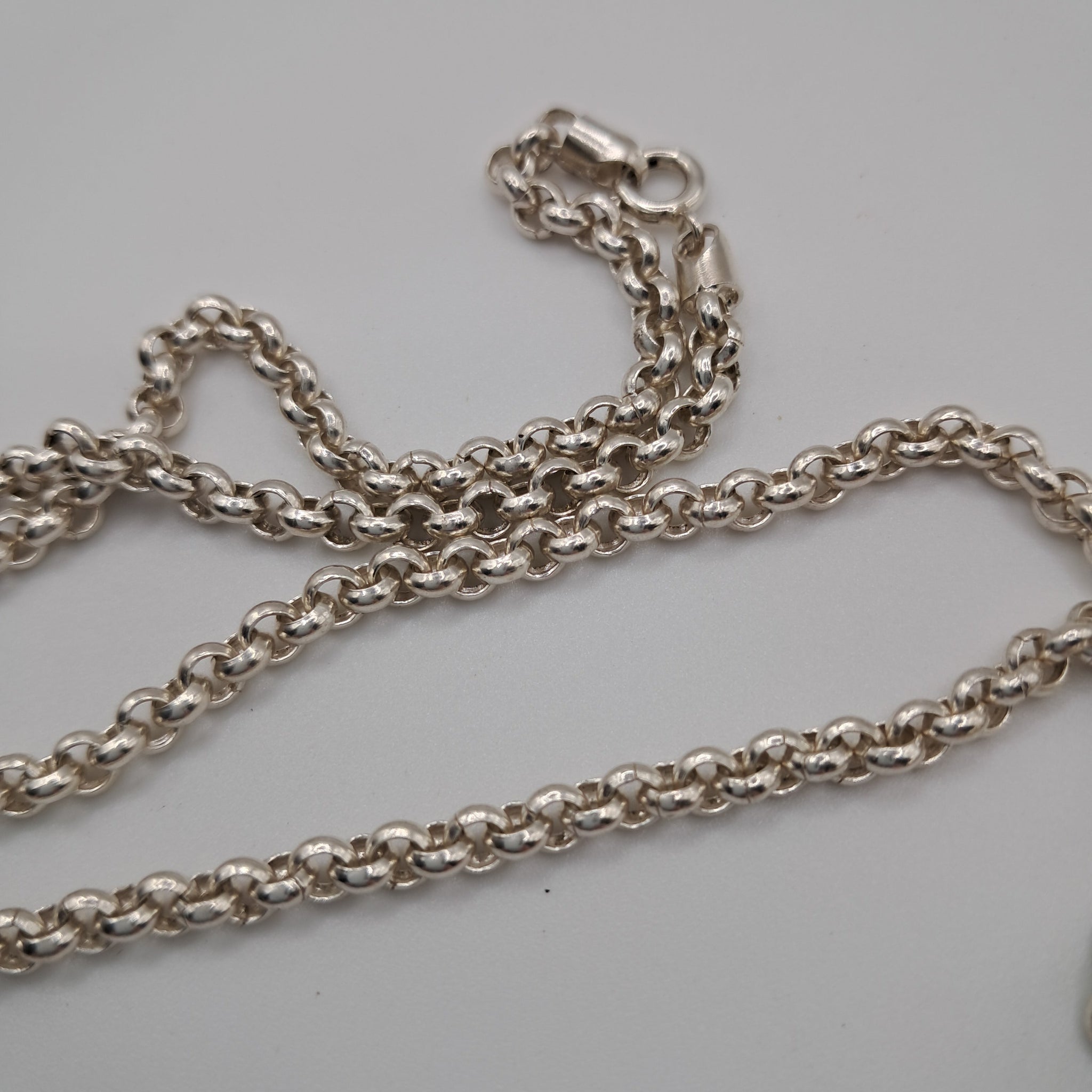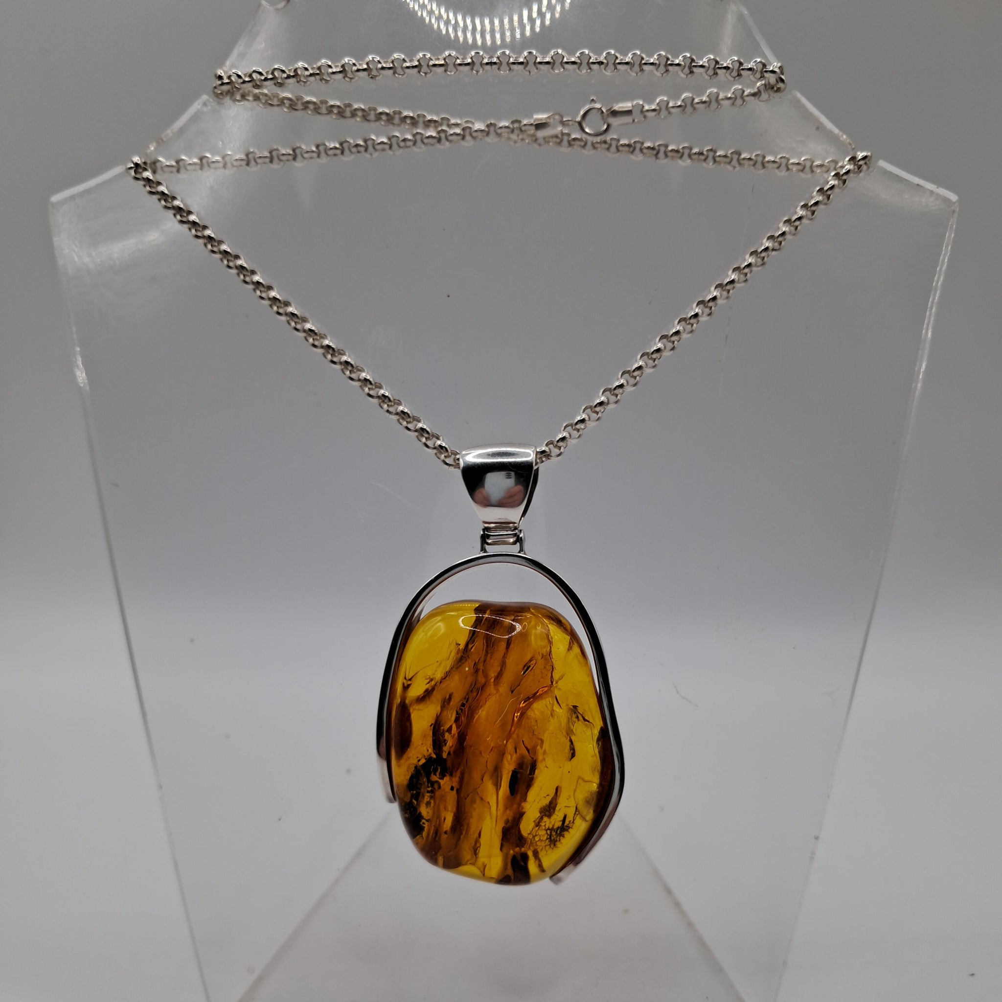 A wonderful chunk of amber with the most unusual inclusions and what may be a little bug which makes this piece quite rare. It has natural fissures to the front and back which also makes it unusual. The pendant measures 7.5 cms x 4.5cms including bale and is fully hallmarked for sterling silver. The gorgeous heavy belcher chain measures 51 cms in length and is also marked for sterling silver. Total weight 46.3g
