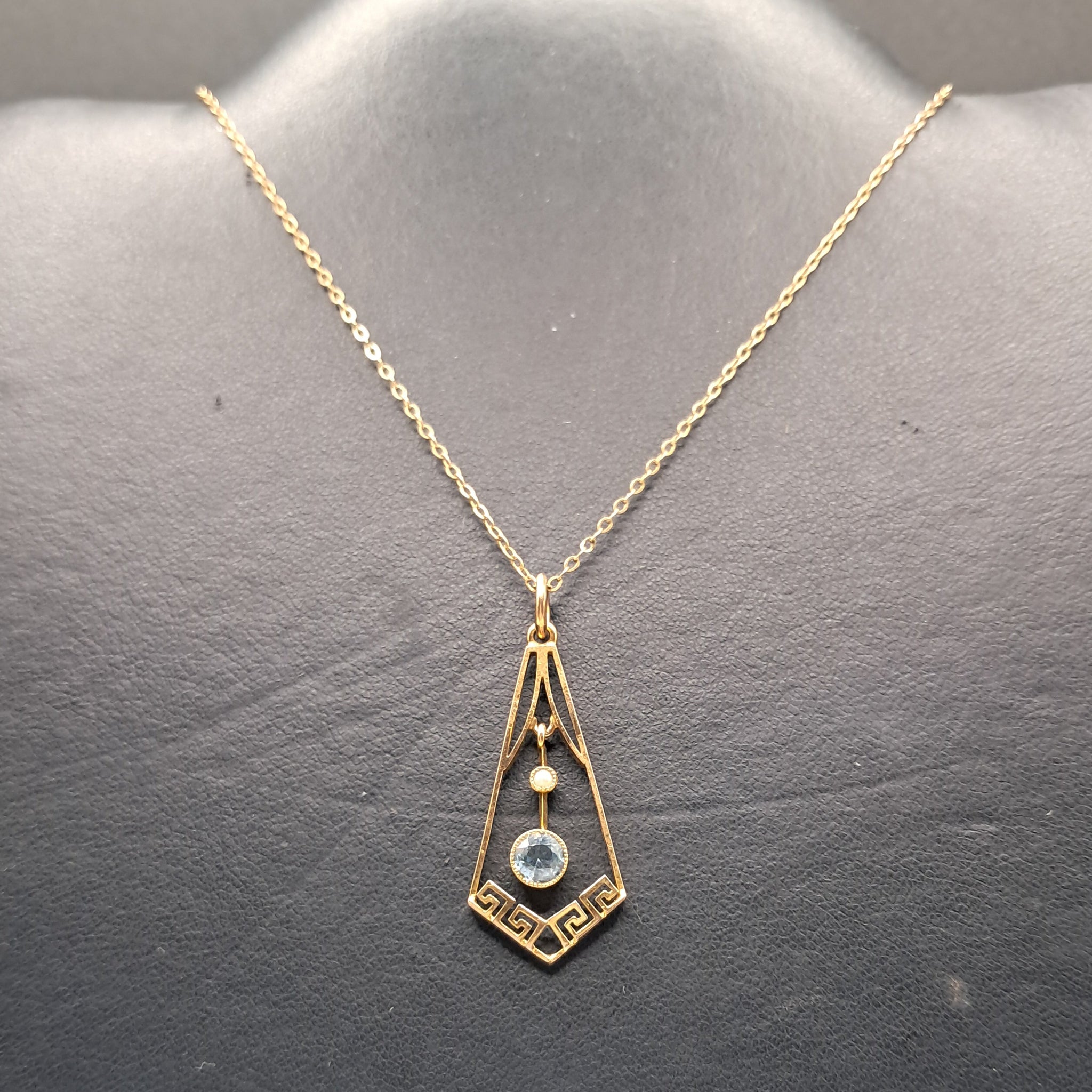 This is an elegant pendant in an unusual gallery with a beautiful millegrain set blue topaz and a split pearl to the centre and a greek key motif to the bottom. It hangs from a 46cm belcher chain and it measures 3.5 cms in length. Both are marked for 9ct gold and dace from c 1970.