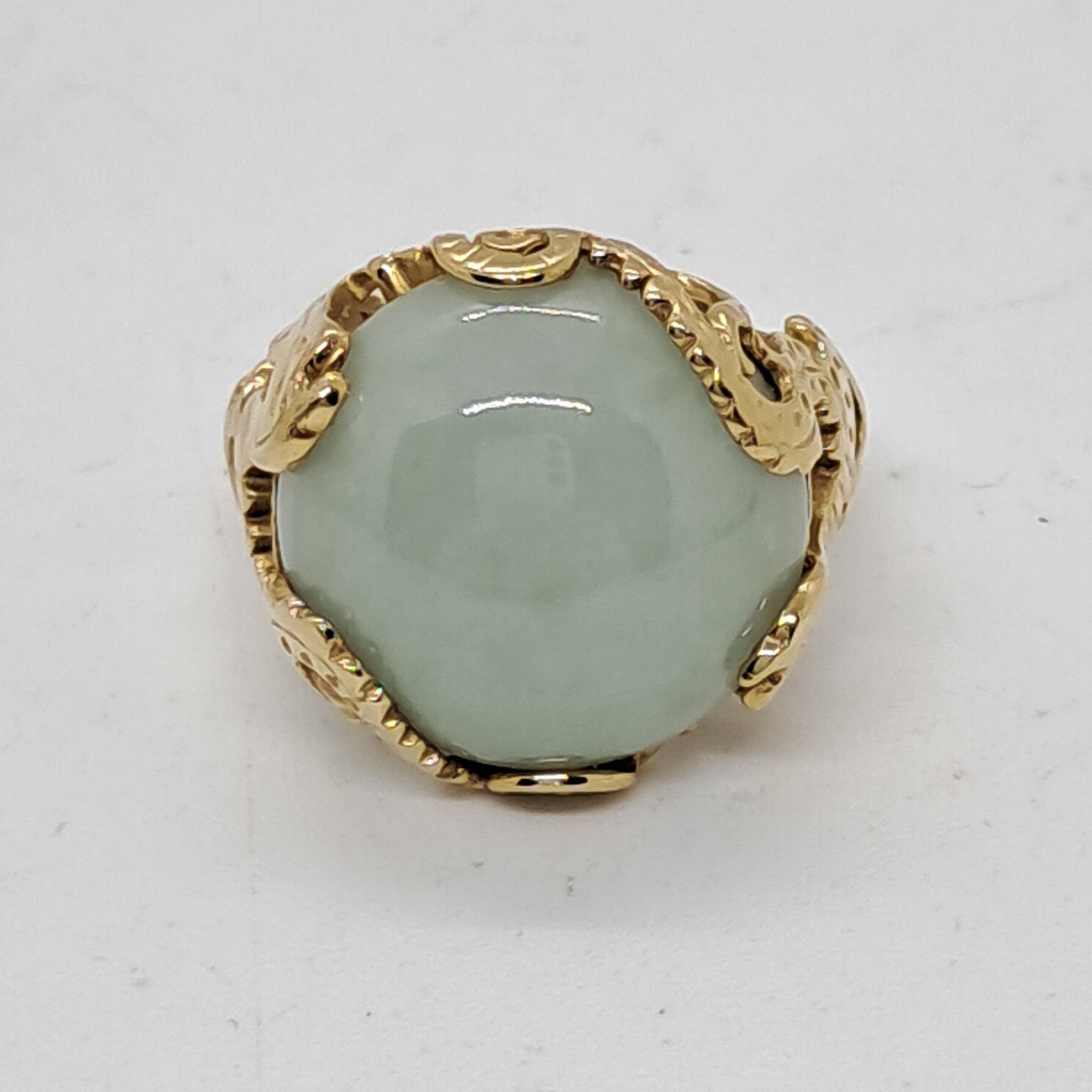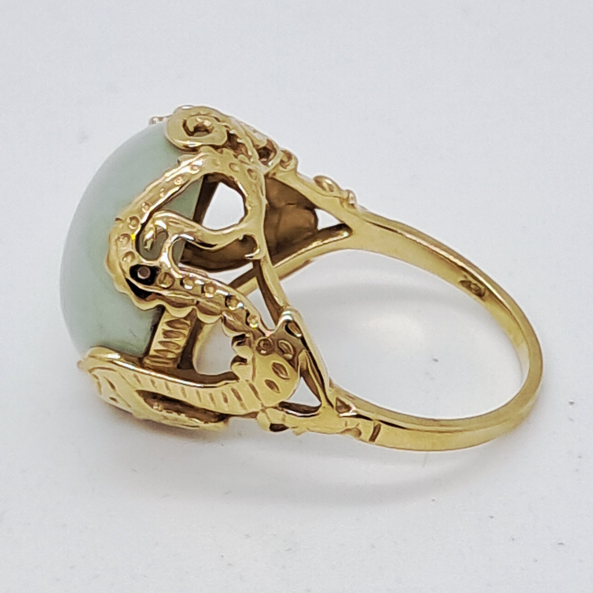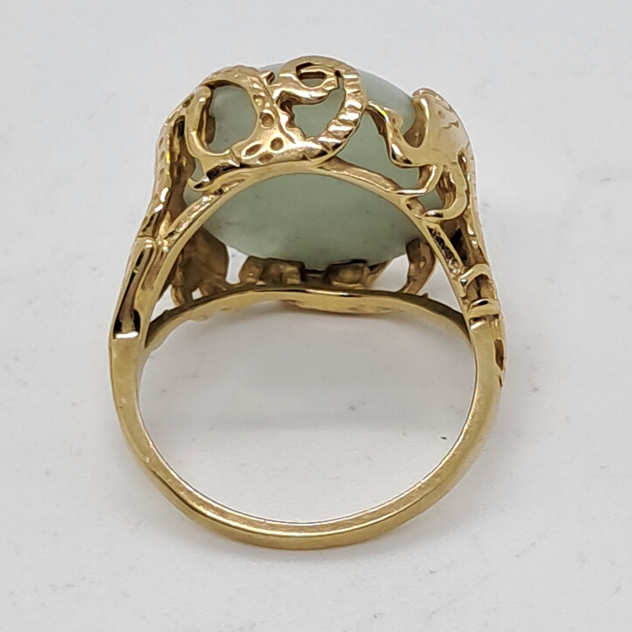 An unusual ring with a cabochon jade stone of approx 6ct,set in a gallery of 14ct gold. The gallery is impressive with two decorative coiling dragons wrapped around the stone from the shoulders up. It is Size O and is fully hallmarked for 14ct gold.