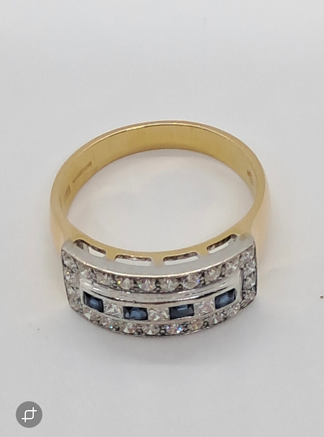 This is a wonderful heavy 18ct gold diamond band ring with four beautiful square cut accent sapphires of a deep cornflower blue colour to the centre panel. The rectangular lozenge is set in this rub over setting with twenty four brilliant round cut diamonds to the outside and three square cut diamonds between the sapphires. Approx .90ct od sparkling diamonds and .20ct sapphires The heavy shank is fully hallmarked for 18ct gold,London 1999. Size O