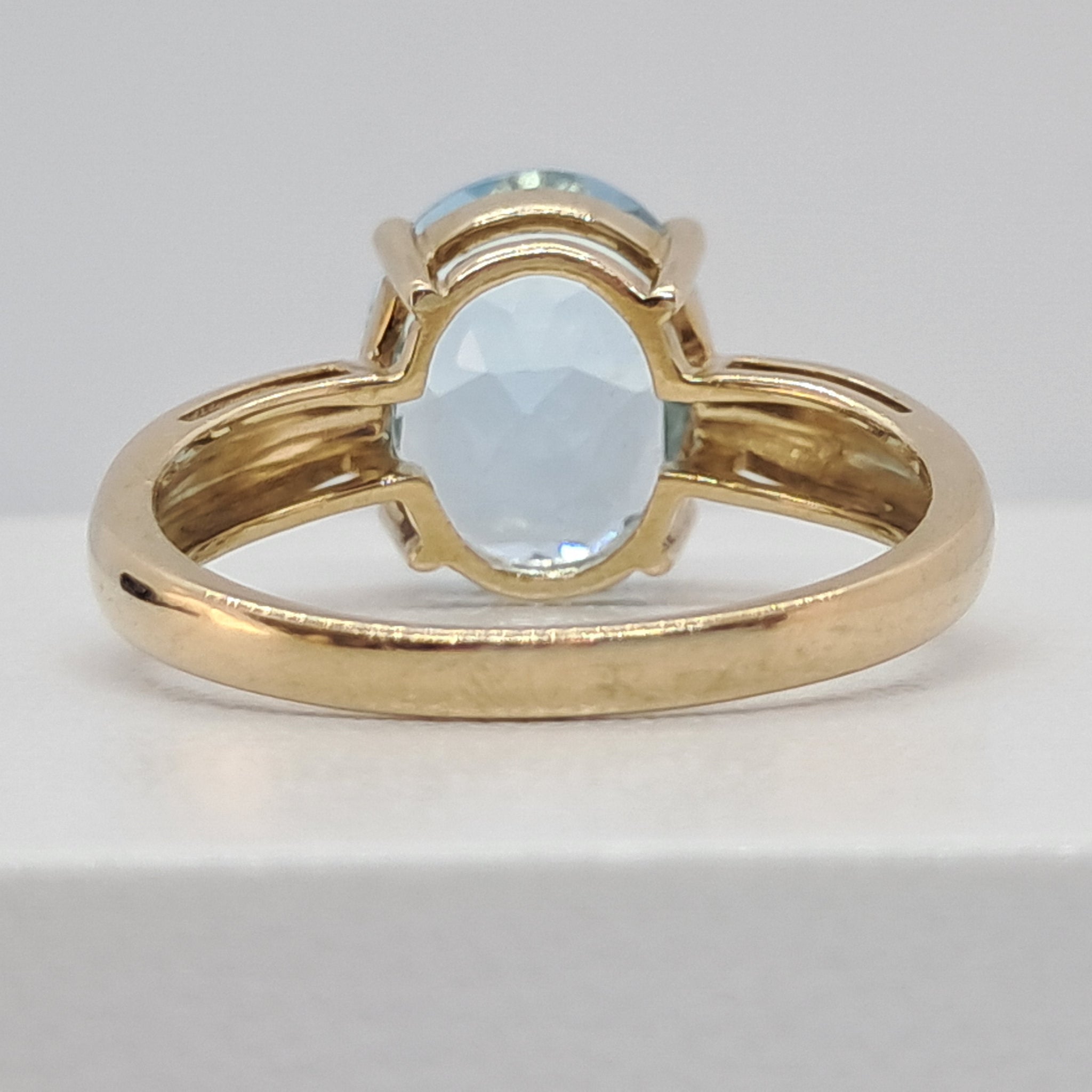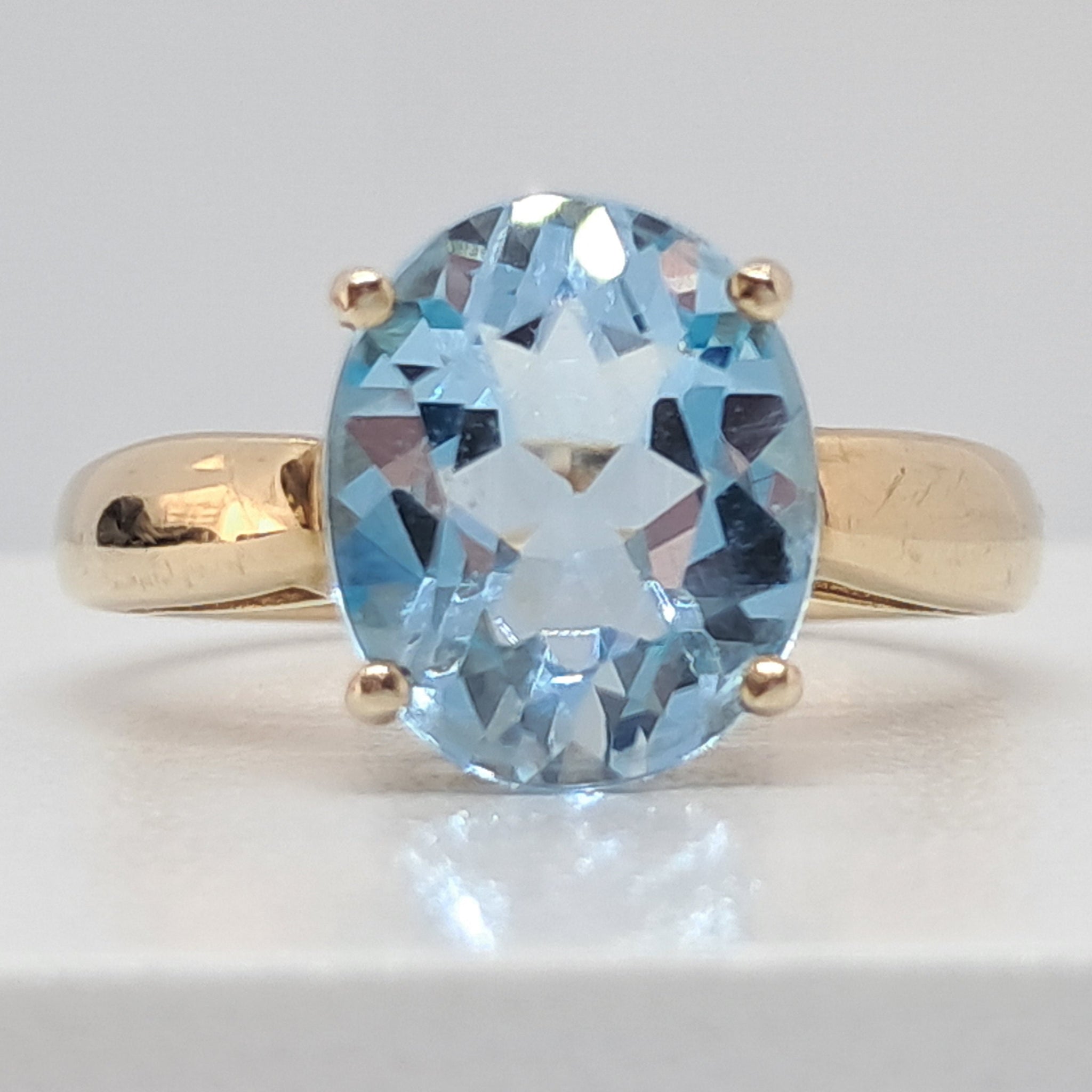 A dazzling blue topaz of approx 4ct claw set in a simple elegant gallery sweeping down to wide shoulders and heavy shank. It is fully hallmarked for 9ct gold and is Size R