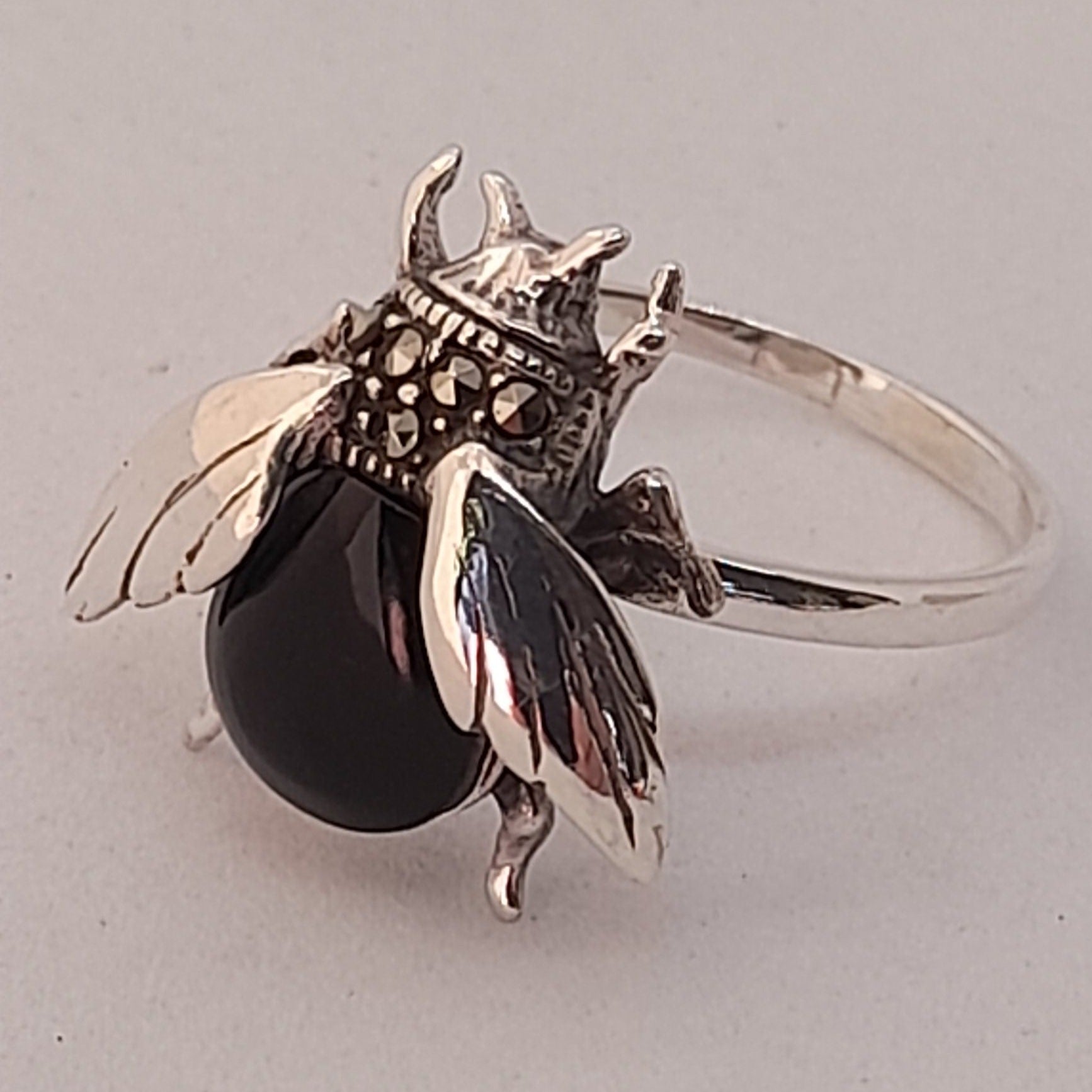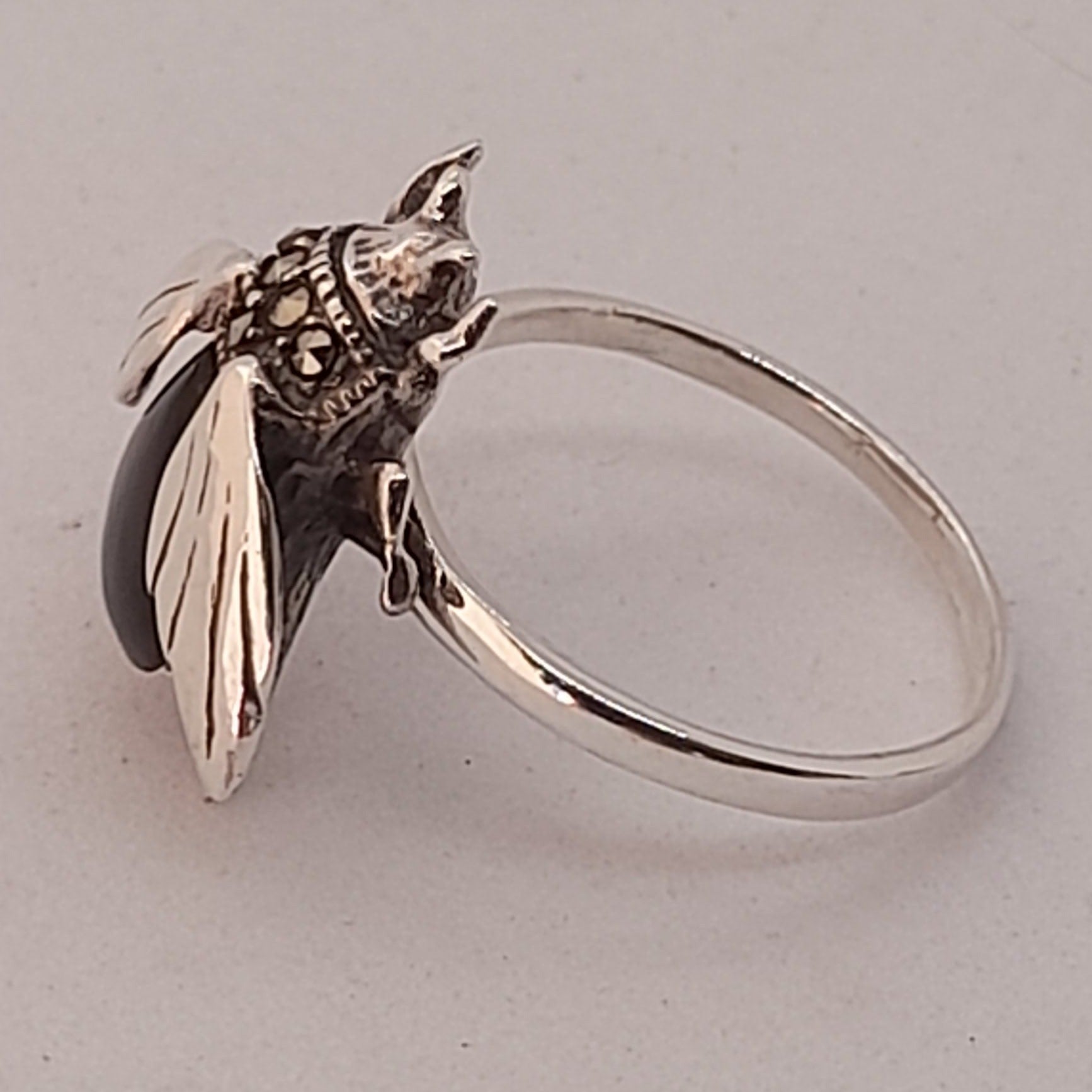 A gorgeous bee ring with a striking black onyx and sparkling marcasite body and lovely silver wings. Classy. Size P/Q  Marked 925.