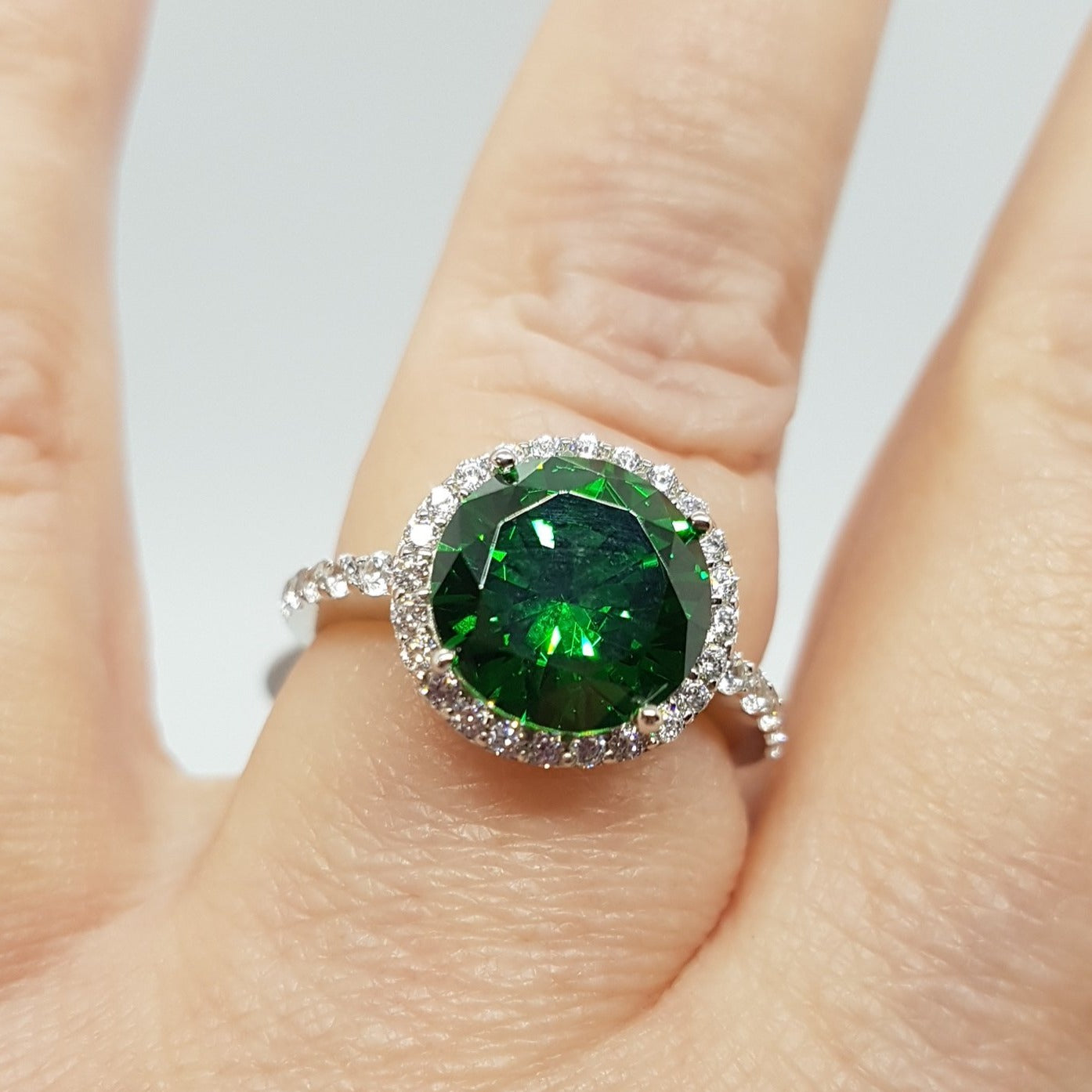 A beautiful claw set green cz to the centre surrounded by sparkling white cz.The white cz continues down the shoulders from a slightly raised gallery.Stunning.Size O