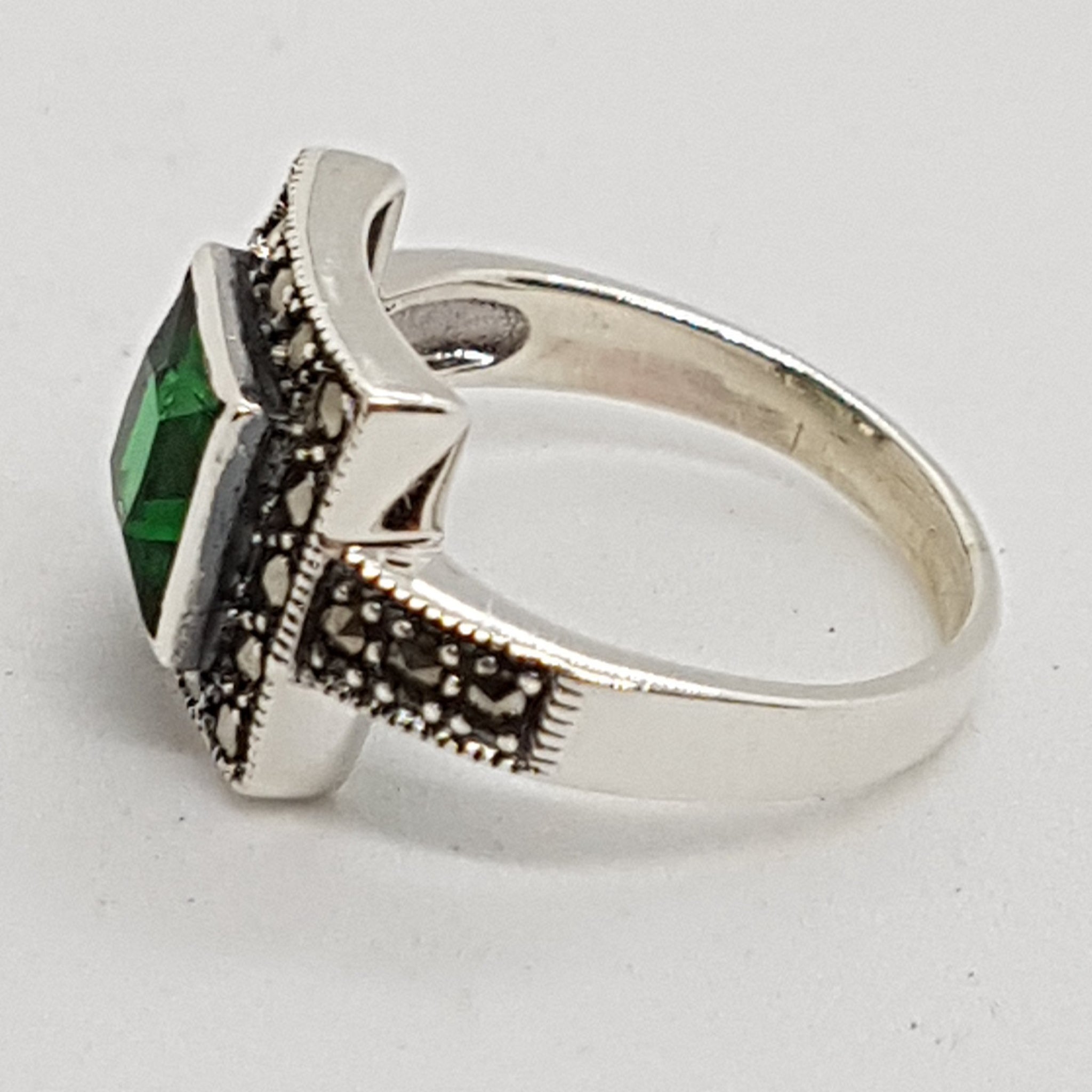 A lovely simple easy to wear silver ring in the art deco style. A lovely square green crystal stone in a frame of marcasite and marcasite also down the shoulders. Size N and is marked 925