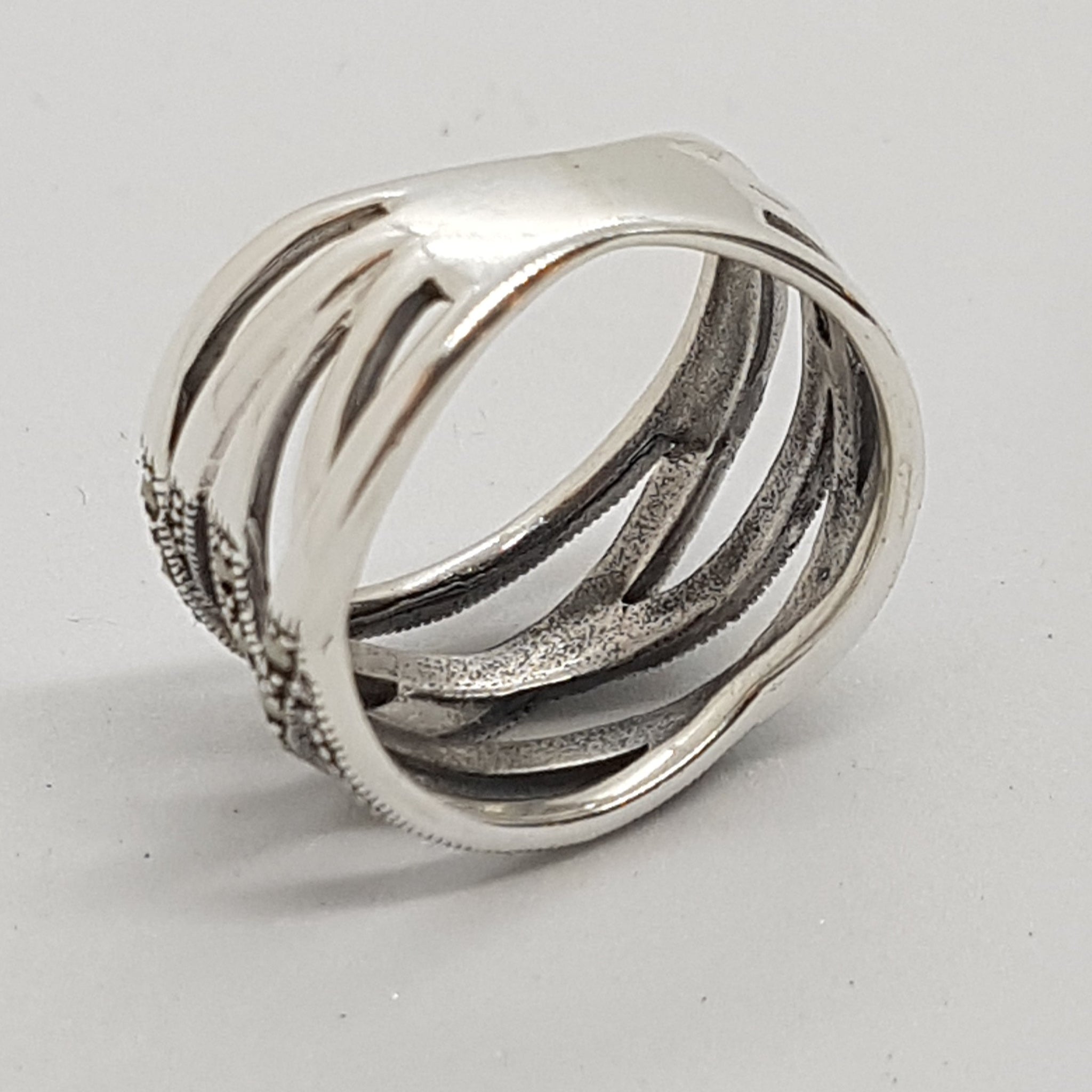 An unusual silver ring with criss-crossed band of silver,the inner ones set with sparkling marcasite. Width of band is 1.5cm. Marked 925 and Size P.