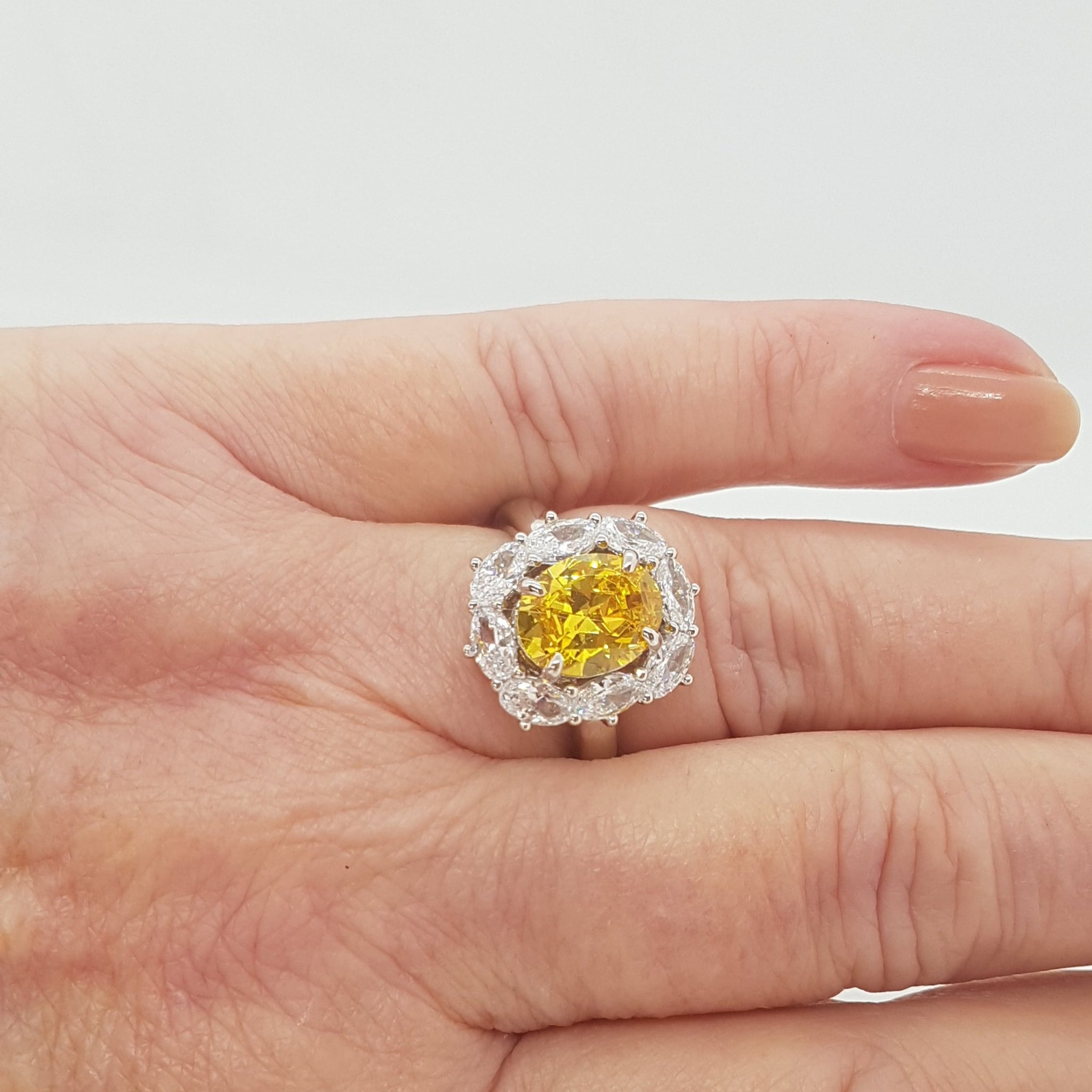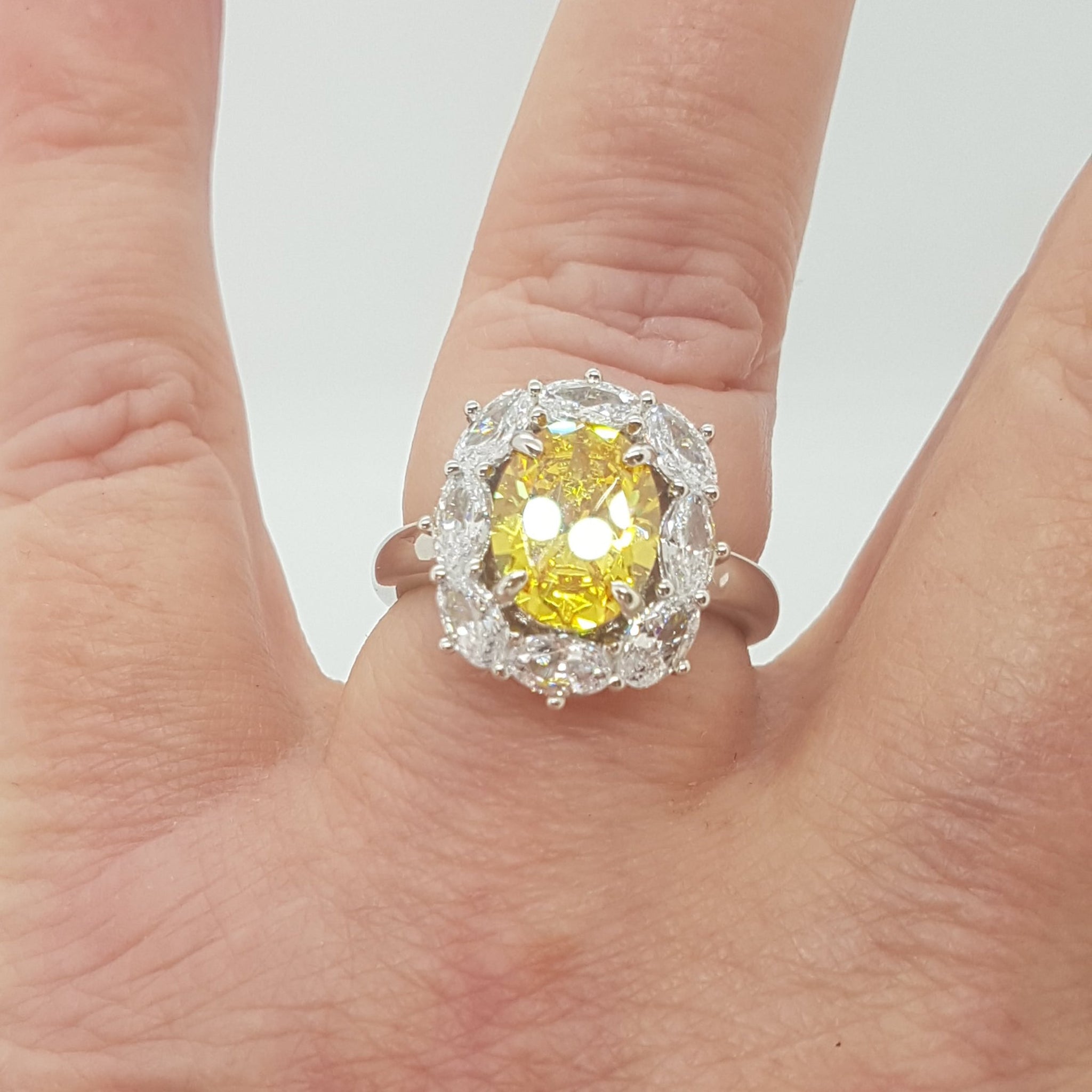 The combination of citrine and white cz is just perfect and this heavy chunky ring shows off that combination to perfection. An emerald cut centre stone with eight dazzling czs framing it.The face of the ring measures 1.6cms x 1.3cms. and the ring itself is Size P1/2 Marked 925 for sterling silver